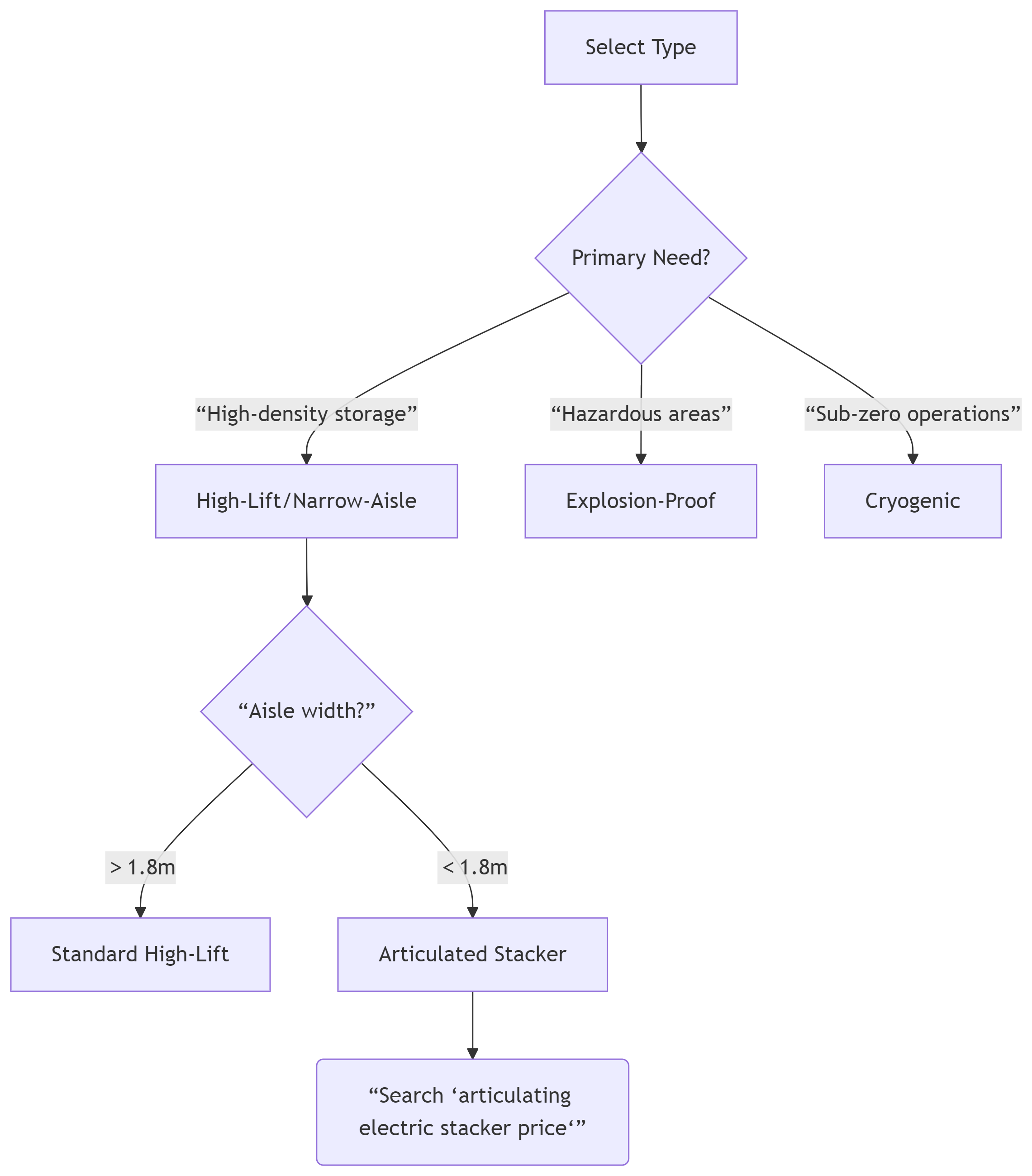 tipe Aisle Width Target Keyword Tri-Directional 1.6-1.8m "tri-directional electric stacker"Articulated 1.4-1.6m "articulating narrow reach truck"3. Explosion-Proof Electric Pallet Jacks