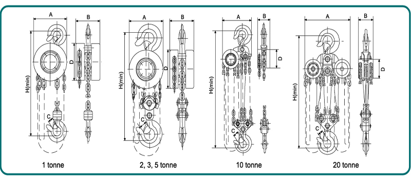 The lever hoist has model HCB10, HCB20, HCB30, HCB50, HCB100, HCB200 for different capacity 1ton, 2ton, 3ton, 5ton, 10ton, 20ton.